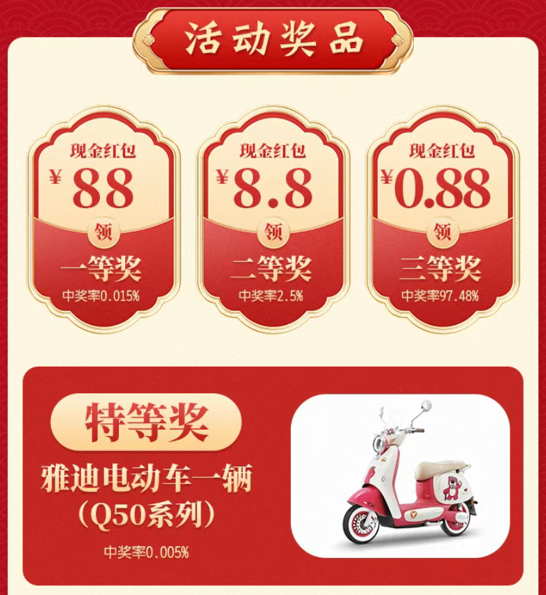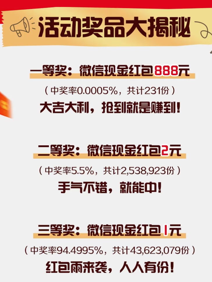 公示中奖概率、奖品数量、最高金额(如 “一等奖 1 名,概率 0.01%;二等奖 10 名,概率 0.1%”);